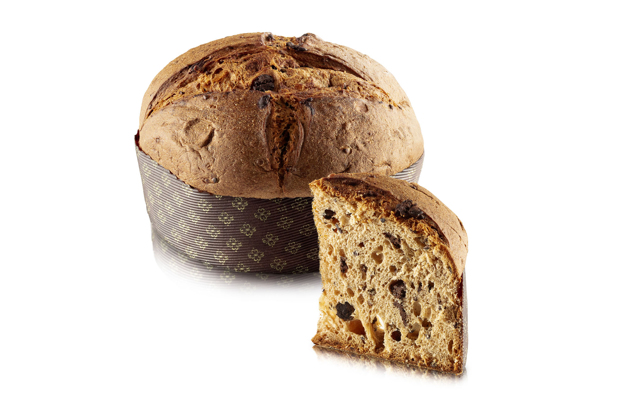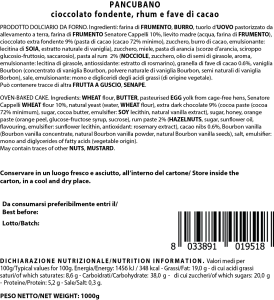 PRODOTTO DOLCIARIO DA FORNO. Ingredienti: farina di FRUMENTO, BURRO, tuorlo d’UOVO pastorizzato da allevamento a terra, farina di FRUMENTO Senatore Cappelli 10%, lievito madre (acqua, farina di FRUMENTO), cioccolato extra fondente 9% (pasta di cacao (cacao 72% minimo), zucchero, burro di cacao, emulsionante: lecitina di SOIA, estratto naturale di vaniglia), zucchero, miele, pasta di arancia (scorze d'arancia, sciroppo glucosio-fruttosio, saccarosio), pasta al rum 2% (NOCCIOLE, zucchero, olio di semi di girasole, aroma, emulsionante: lecitina di girasole, antiossidante: estratto di rosmarino), granella di fave di cacao 0.6%, vaniglia Bourbon (concentrato di vaniglia Bourbon, polvere naturale di vaniglia Bourbon, semi naturali di vaniglia Borbon), sale, emulsionante: mono e digliceridi degli acidi grassi (di origine vegetale).
