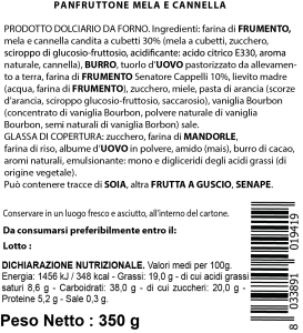 PRODOTTO DOLCIARIO DA FORNO. Ingredienti: farina di FRUMENTO, mela e cannella candita a cubetti 30% (mela a cubetti, zucchero, sciroppo di glucosio-fruttosio, acidificante: acido citrico E330, aroma naturale, cannella), BURRO, tuorlo d’UOVO pastorizzato da allevamento a terra, farina di FRUMENTO Senatore Cappelli 10%, lievito madre (acqua, farina di FRUMENTO), zucchero, miele, vaniglia Bourbon (concentrato di vaniglia Bourbon, polvere naturale di vaniglia Bourbon, semi naturali di vaniglia Borbon) sale.